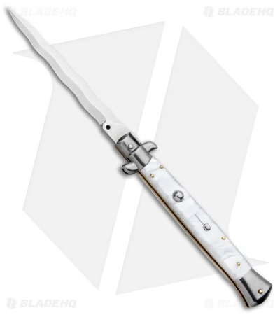 This 11″ Italian Stiletto from Frank B. features classic stiletto style with a white acrylic handle and a polished kris style blade. Frank B creates some of the finest authentic Italian stilettos available on the market today. This 11″ model has an acrylic handle with nickel silver bolsters. Brass pins and liners add a classic touch to the design. Add the premier Italian knife-maker to your collection today with an authentic Italian stiletto from Frank B.