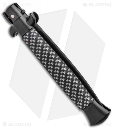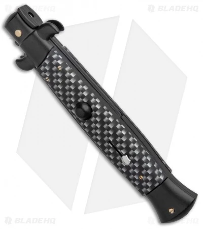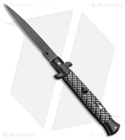 This 9″ Italian Stiletto from Frank B. features classic stiletto style with a simulated carbon fiber handle and a black finished blade. Frank B creates some of the finest authentic Italian stilettos available on the market today. This 9″ model has a simulated carbon fiber handle with stainless steel bolsters and liners. Brass pins add a classic touch to the design. Add the premier Italian knife-maker to your collection today with an authentic Italian stiletto from Frank B.