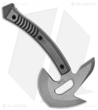 The Maserin Combat Tomahawk offers a heavy duty combat axe for your most extreme tactical needs. This model is built with gray G-10 handle and a full tang D2 steel blade with a rounded tail spike. It features a bearded head and an extended striker tang. Item includes a MOLLE compatible sheath.