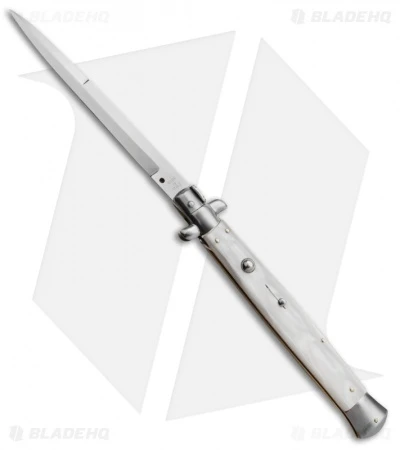 This 13″ Italian Stiletto from SKM Italy offers classic stiletto style with a white pearlex handle and a bayonet blade. SKM makes a variety of Italian stilettos featuring traditional designs at an affordable price. This 13″ model has a pearlex handle with stainless steel bolsters. Brass pins and liners add a classic finishing touch to the piece. The bayonet blade has a plain edge and a satin finish. Experience the affordable Italian quality of these authentic stilettos from SKM Italy.